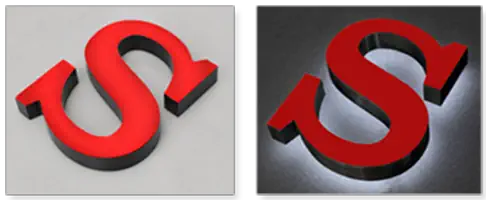 I denne mulighed lyser fronten af bogstavet, hvilket betyder, at lyset trænger igennem fronten lavet af plexiglas, hvilket fremhæver farven og formen af tegnet. Det er en klassisk løsning anvendt i lysreklamer, der sikrer høj synlighed og intens belysning.